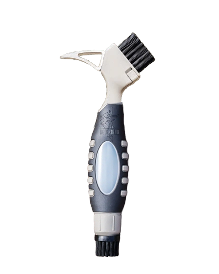 A hoof pick is used to remove dirt, pebbles, and debris lodged in the hoof. It is used in conjunction with a brush for deep cleaning without damaging the sensitive structures of the hoof.